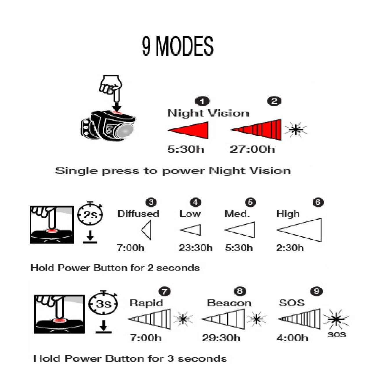 - 2 red light modes: Steady and flash