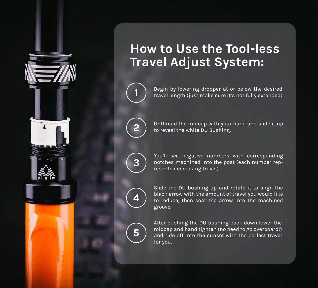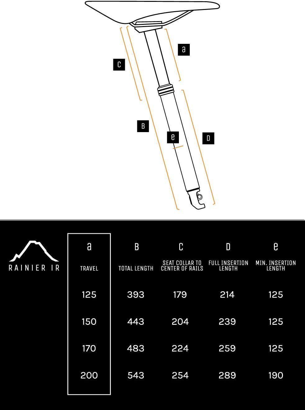 It’s 2020 and we like to customize everything from our kicks to our vitamins. We wanted to take that customization lifestyle into the world of droppers with the updated Rainier IR. The past version of this post is known for its consistency and reliability. While maintaining those qualities, this new iteration focuses on fitting more bikes and providing refined adjustability for the rider. So how did we do that? First, we leveraged our new tool-less travel adjust system, which allows for a total of 30mm travel reduction in 5mm increments. If you were riding that line between a 170mm and 200mm dropper you can now fine tune the perfect fit. Like finding the perfect chamois that holds you close but doesn’t create an excess of muffin top. Secondly, the redesigned Rainier is significantly shorter than our other posts. We scrubbed overall length of the post by minimizing the size of the bottom actuator and shortening the lower tube. Overall length reductions vary by travel but we were able to knock out 27.5mm of overall length from our 125mm size. Combining all of these changes means this version of the Rainier can fit into more bikes while also maximizing the amount of travel available. That is some pretty nifty design if we do say so ourselves. What does this do for your riding experience? In the past, riders often had to choose a shorter travel post than they would prefer in order to get the correct fit. Now, with the 5mm incremental change riders can get the exact amount of travel they desire. The beauty of this system is the simplicity. You can literally pull off to the side of the trail and adjust the travel with nothing but your fingernail. Seriously, it’s that easy!