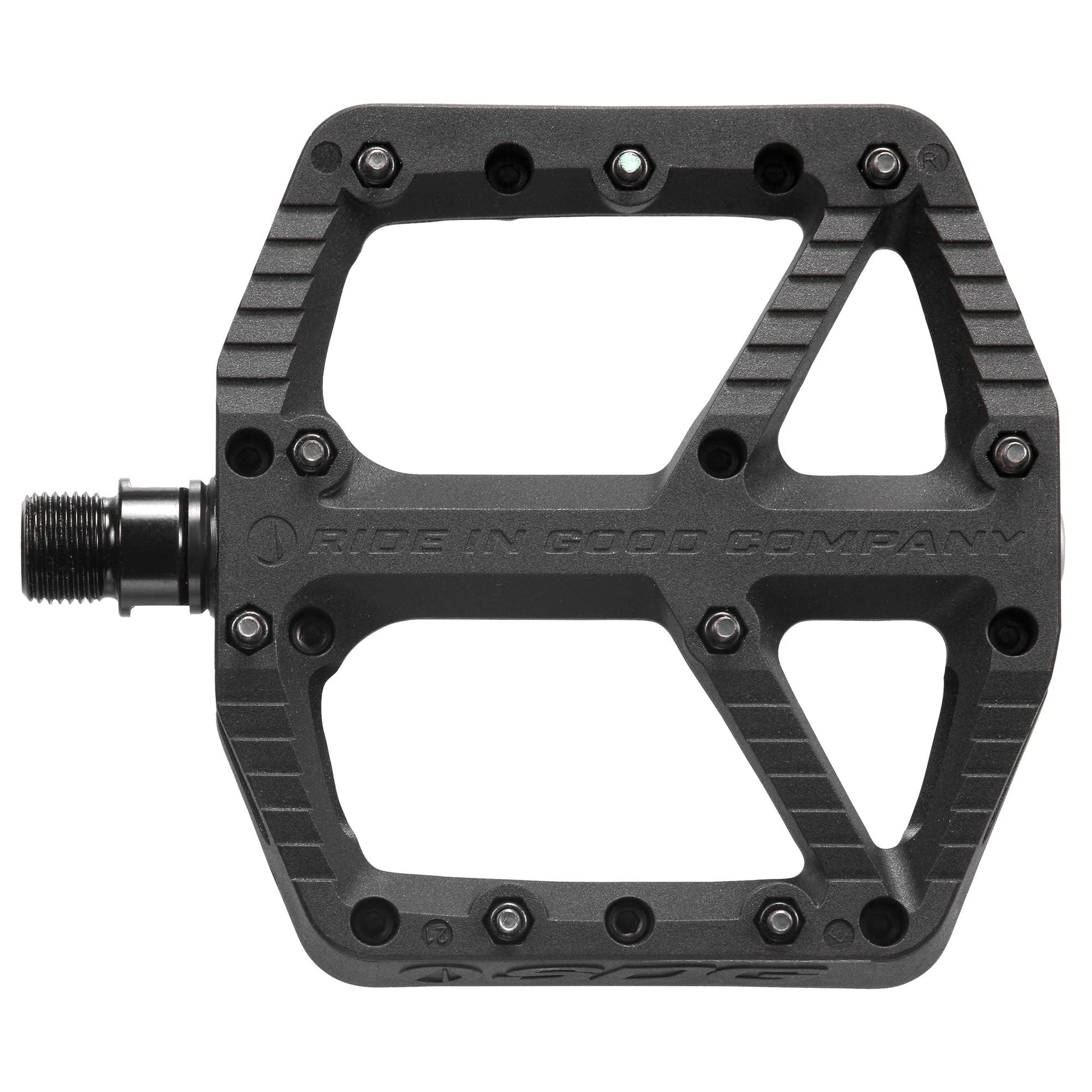 SDG Components, Comp, Platform Pedals, Body: Composite, Spindle: Cr-Mo, 9/16'', Black, PairMaterial - composite reinforced nylon body cage with replaceable traction pins & machined 9/16" Cro-Mo spindleFlat 110mm x 105mm Profile - Maximum contact patch with a flat profile to ensure complete pedal control.9x Bottom Loading Pins Per Side - – Plenty of pins to dig into your shoes and bottom loading so they’re easy to replace.Ramped & Undercut Gripper Profile - This proven shape helps to provide even more fore and aft traction.Proven Bearing & Bushing System - These have demonstrated excellent durability and are as easy as can be to replace when they finally wear out.