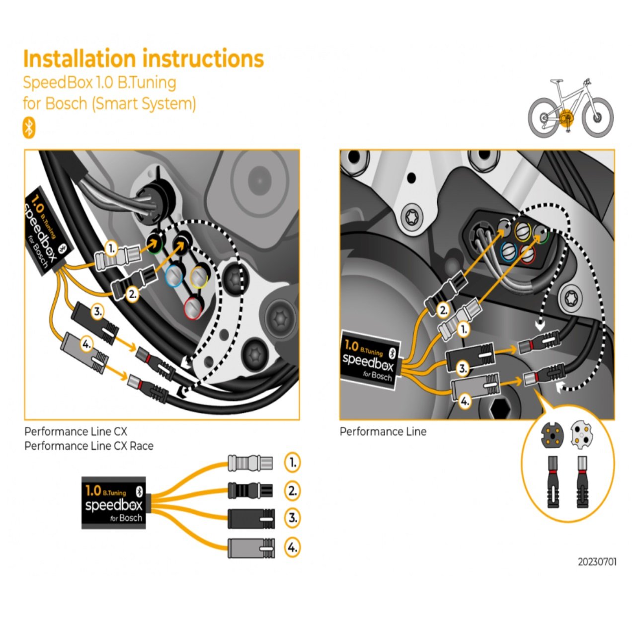 SpeedBox 1.0 B.Tuning for Bosch (Smart System) Display shows: Readable actual speed correct travelled distance (after the countdown process is finished) Compatible with: displays KIOX 300 motors Bosch Gen4 + Smart System SpeedBox App Legal Please note that the operation of this type of modified electric bikes on public roads may be against the law in some countries. The manufacturer takes no responsibility for damages resulting from the use SpeedBox products. Electric bikes equipped with SpeedBox products are not allowed to be used on public roads, cycling paths and public places. Electric bikes equipped with SpeedBox products can be used exclusively on private property and entirely at one’s own risk. The use of SpeedBox may void the warranty of your ebike. We strongly recommend using other safety features and protective gear to prevent injuries in higher speeds. SpeedBox Products are thoroughly tested and we stand by their quality. SpeedBox provide Life Long warranty to all their Products! If You have any questions, please do not hesitate to contact us. Thank you for looking! Two Wheels Empire Team