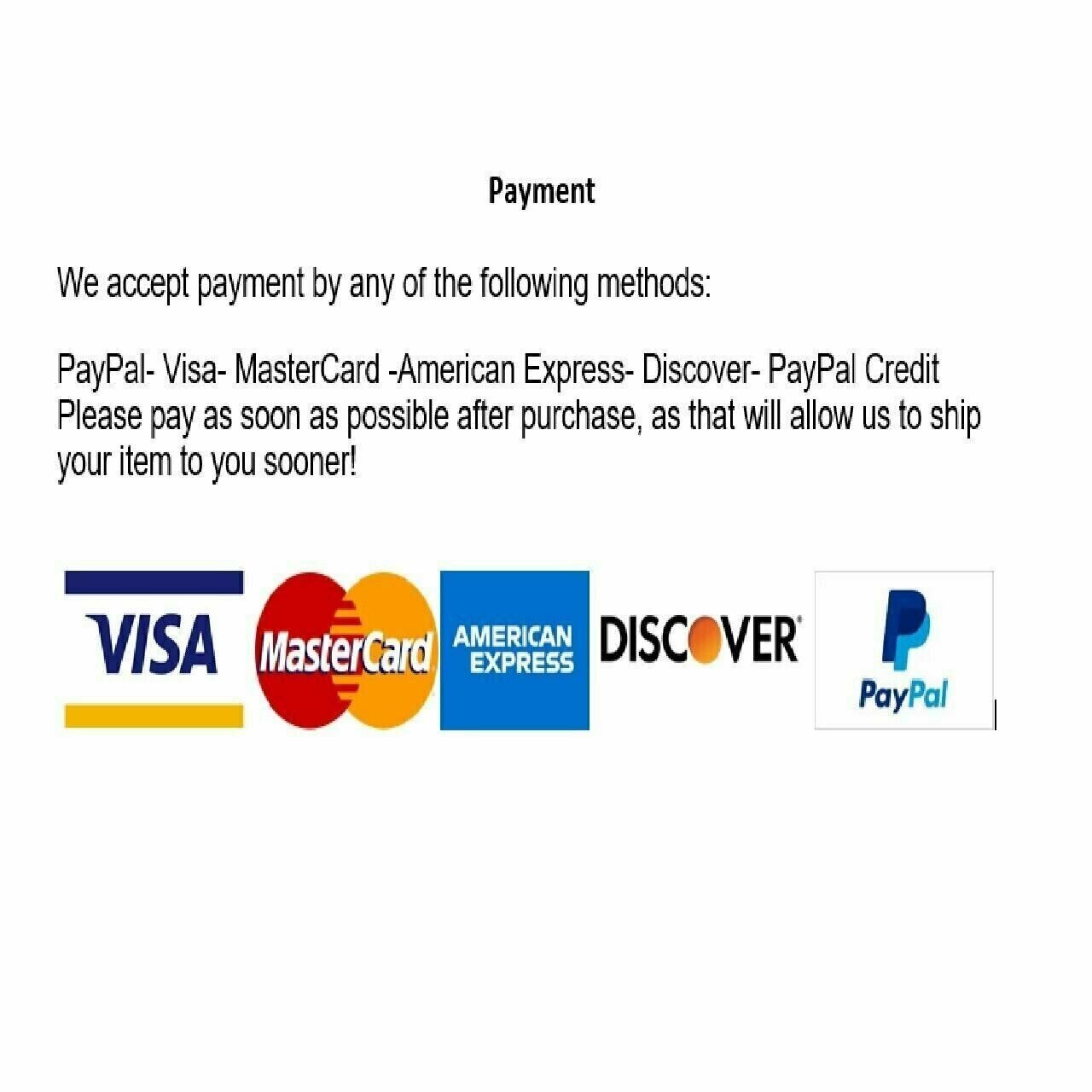 We accept payment by any of the following methods: PayPal- Visa- MasterCard -American Express- Discover- PayPal Credit Please pay as soon as possible after purchase, as that will allow us to Ship your item to you sooner!